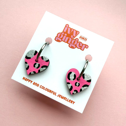 Bright pink and silver leopard print heart shaped hoop earrings