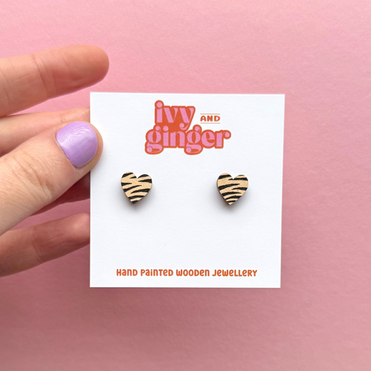 Mini cream and black zebra print heart stud earrings
