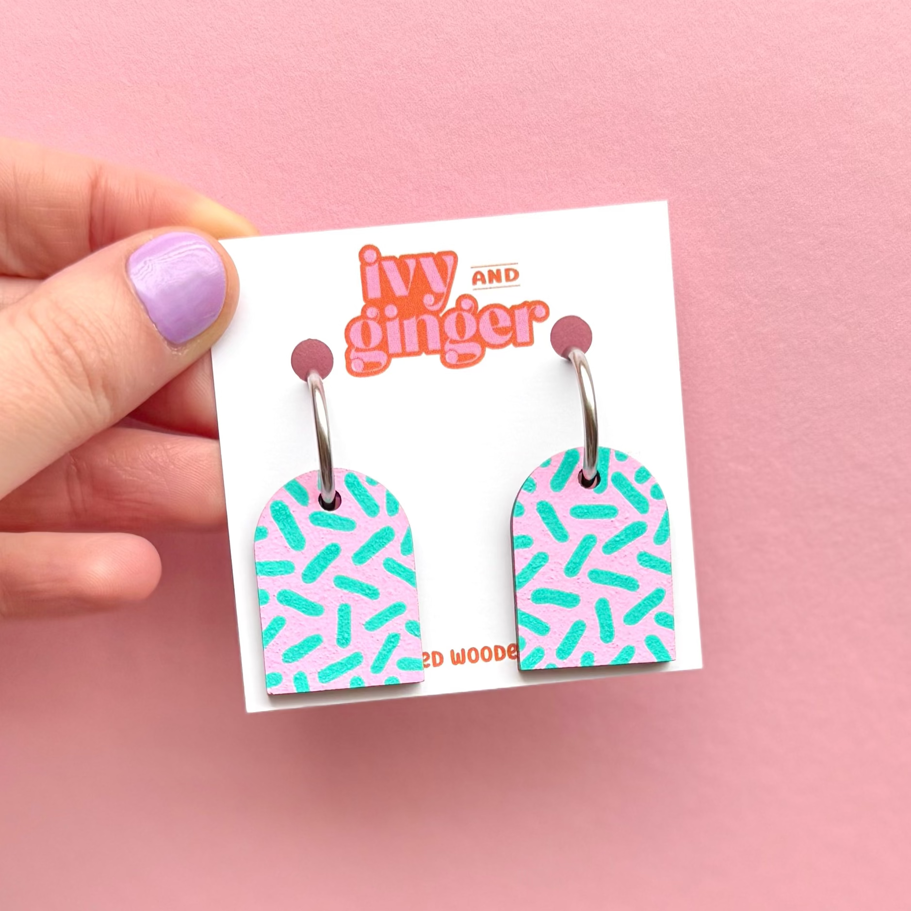 Hand painted dangle arch earrings in a bold dash print, making them a perfect statement piece to add a touch of fun to your earring collection.