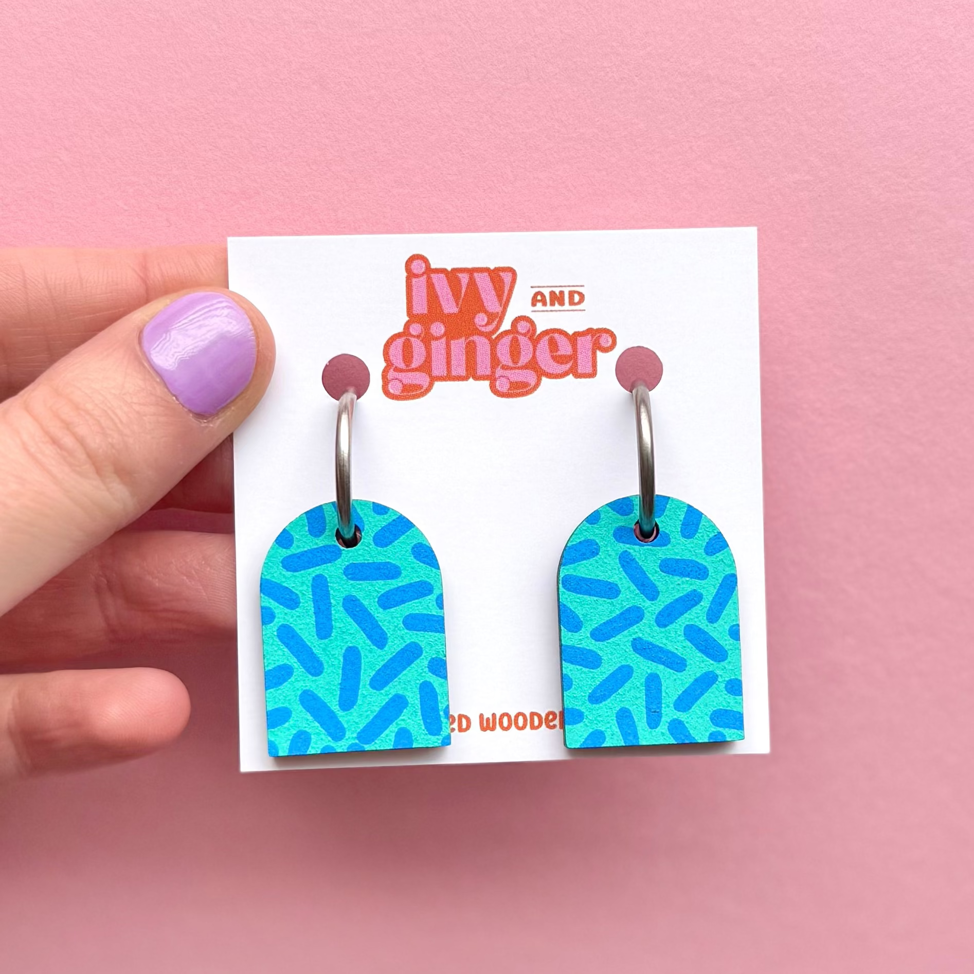 Hand painted dangle arch earrings in a bold dash print, making them a perfect statement piece to add a touch of fun to your earring collection.